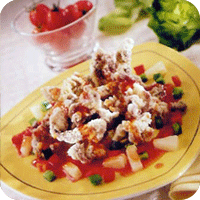 7. 烧热煎盘或煎锅,加大约3大匙菜油。油沸热时,放进蒜头,炒至爆香,再加2包李锦记甜酸排骨酱,酱料沸热时,即可取出淋在炸好的五花肉上,并加配生菜点缀食用。