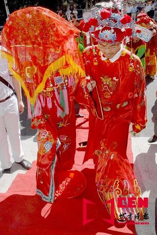 新娘告诉记者,她很喜欢这身打扮,而且她对中国这富有古老韵味的国家更是深深的吸引。早上8点半,接送新娘的大红花轿来了,新郎走进屋子给新娘鞠了个躬,轻轻把新娘抱起。生怕错过每一个环节,漂亮的新娘很认真地询问新郎每一个步骤。坐在大花轿里的伊丽莎白不时地掀起头上的红盖头,露出娇羞的微笑。这一路上,满脸堆笑的轿夫大步地抬着花轿走着,舞狮子和扭秧歌的演出团也是个个精神十足。新郎走在花轿前面,披红戴花,笑容是那样幸福。敲锣打鼓声让所有人都沉浸在欢快的这传统婚礼中。