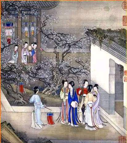 二月 寒夜寻梅 正月里, 上元之夜,华灯溢彩,银月似盘,梅花绽放,宫中贵妇们结伴游赏。