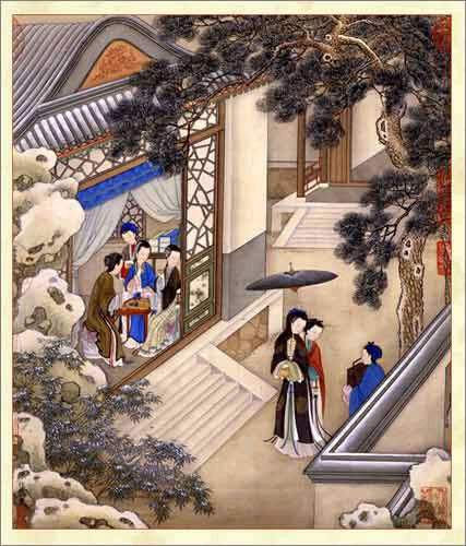 一月 踏雪寻诗腊月中,天寒地冻,贵妇们聚于温暖的厅堂中,衣边烹茶,衣边观雪,吟诗作乐,时有女伴裘衣貂帽,踏雪携,前来助兴。